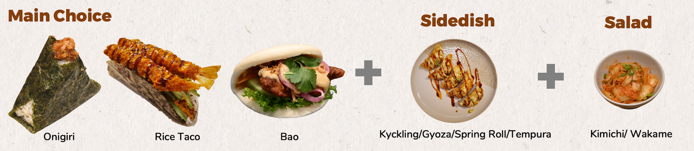 4. PLUS Rice Taco/ Bao Combo…………………………………… 159kr (2st Rice Taco or Bao)